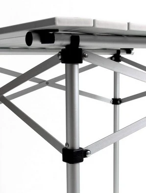 Die spezielle Konstruktion aus Aluminium bringt nur 3.330g auf die Waage und lässt sich sehr einfach aufbauen. Das Gestell wird einfach auseinandergezogen, die Tischplatte auseinandergerollt, mit zwei Querstangen versehen und auf das Gestell gesteckt. Und schon steht der Tisch stabil und sicher auch auf unebenen Untergründen.