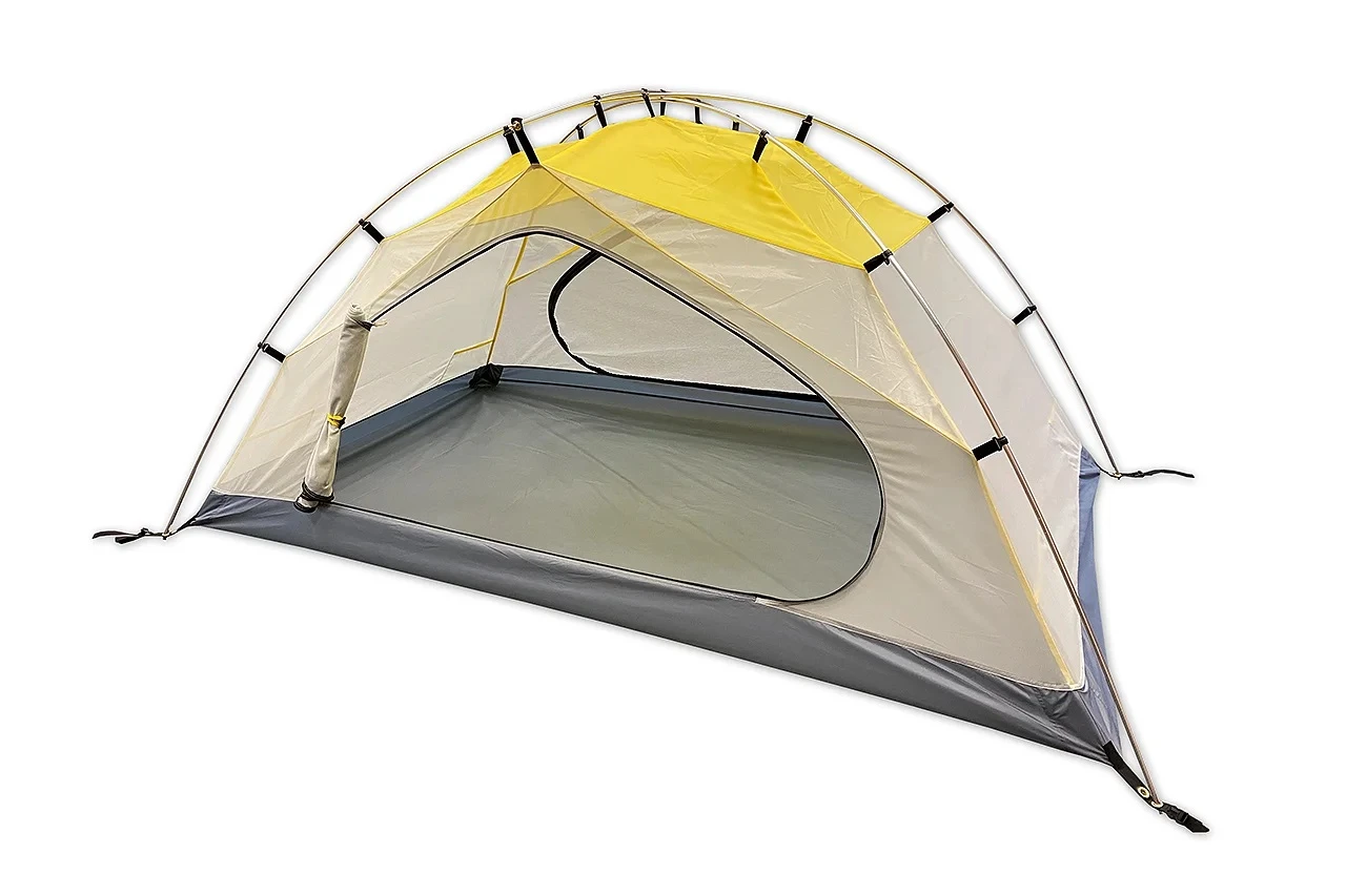 Das Zelt ist aus einem 75D Ripstop-Polyester gefertigt und verfügt über 8.000mm Wassersäule am Boden. In Kombination mit dem 8,5mm Aluminiumgestänge hält es einem starken Sturm problemlos Stand. Das Trekkingzelt hat eine Firststange, ein zusammengebautes Komplettgerüst und ein innenliegendes, farblich eloxiertes Gestänge. Zuerst wird das Innenzelt aufgebaut und dann die Aussenhaut darüber gelegt und fixiert. Aufbaudauer ca. 4-5 Minuten