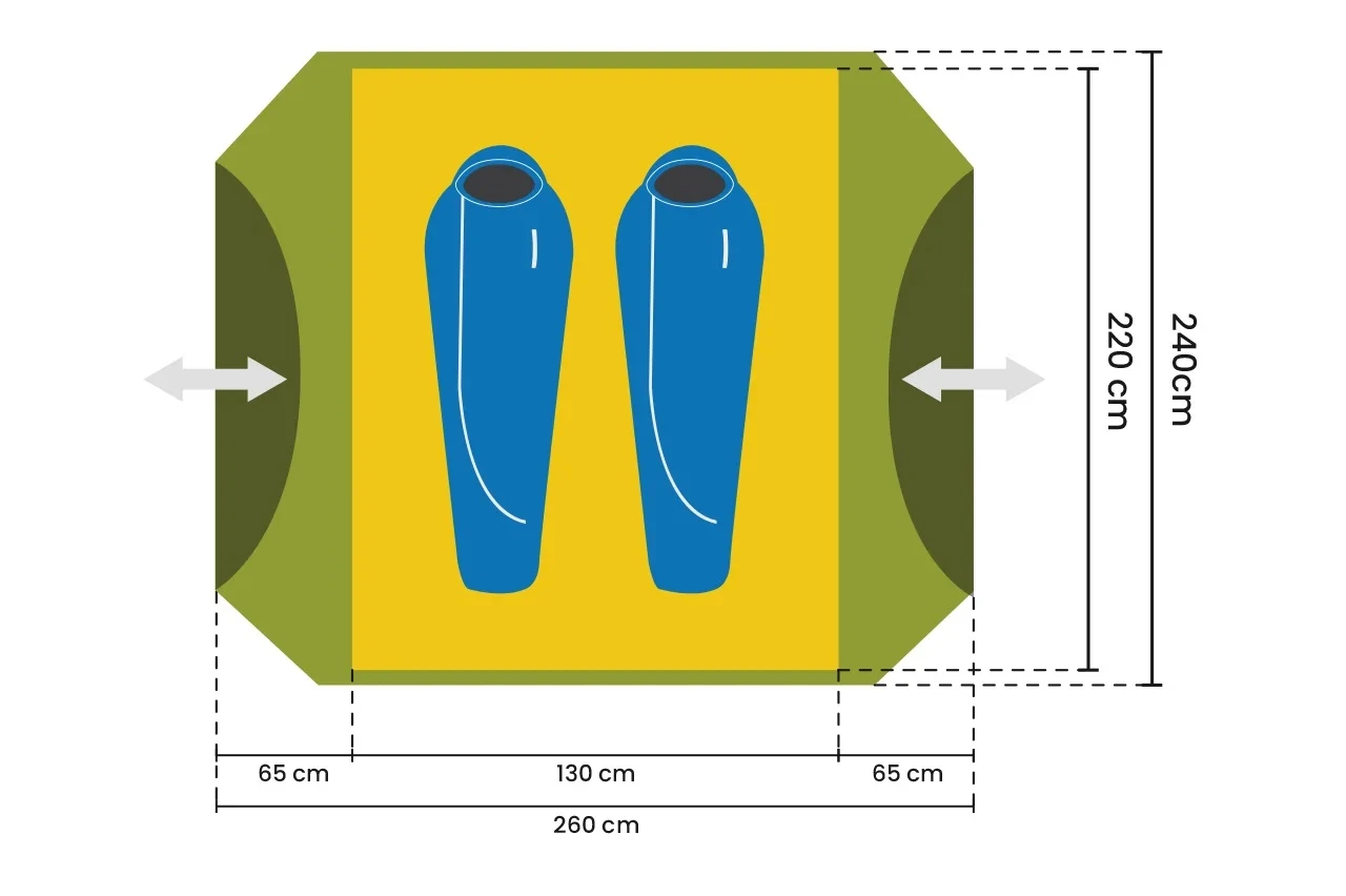 In den zwei Eingangsbereichen hast du die Möglichkeit, dein Gepäck trocken zu verstauen oder bei schlechtem Wetter notfalls etwas zu kochen. Durch die steilen Wände und den großzügigen Schnitt erhält man im Agadir ein unglaubliches Raumgefühl. Alles in allem ein grundsolides Zelt aus hochwertigen Materialien.