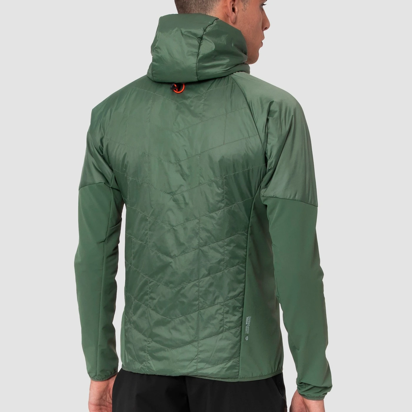Die thermoregulierende Hybridjacke besitzt ein leichtes Isoliergewebe, das verstärkte Polyesterfasern (mit thermoaktive Mineralien) mit Wolle von Tiroler Bergschafen kombiniert. Das Isolationsmaterial nimmt die vom Körper abgegebene Wärme auf und verwandelt diese in Infrarotstrahlung, die gespeichert und wieder reflektiert wird und somit länger warm hält. Durch das kleine Packmaß passt die Jacke auch perfekt in kleinere Rucksäcke.